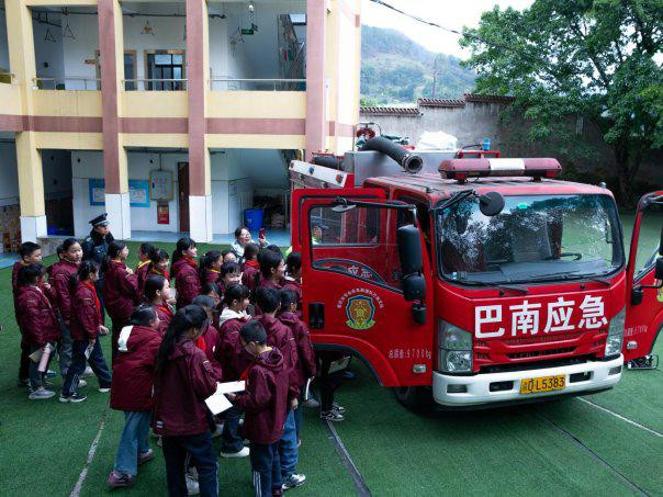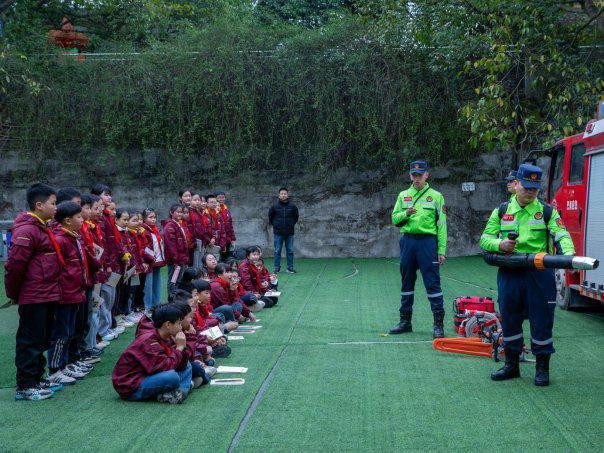 在随后的应急救援装备观摩活动中,重庆专业应急救援队巴南支队的队员通过问答、互动等方式,向同学们展示了消防水车及随车救援装备,并给大家讲解了部分装备的功能及使用方法。同学们听得认真、看得仔细,纷纷争先上前体验当“应急队员”的感觉。